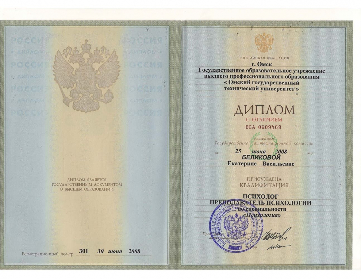 Омский государственный технический университет, дата окончания — июль 2008, факультет гуманитарного образования, специальность «Психолог, преподаватель психологии», форма обучения — дневная/очная