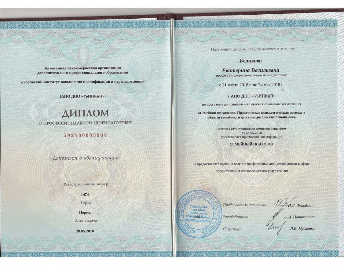 - «Семейная психология. Практическая психологическая помощь в области семейных и детско-родительских отношений» УрИПКиП 2018