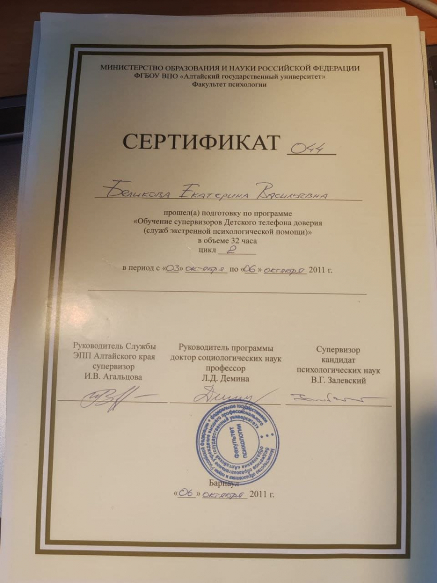 - 2011- 2012,консультант службы телефона доверия и навыки супервизии специалистов службы, БУ «Центр социальной помощи семье и детям (с социальной гостиницей)»