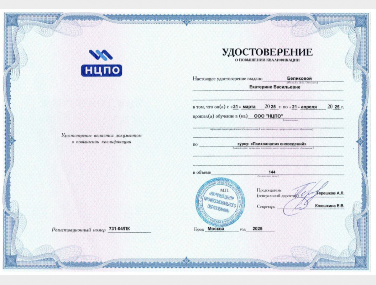 - Психопрофилактика, психокоррекция, психотерапия по запросам аффективных расстройств в сопровождении врача: посттравматическое стрессовое расстройство (ПТСР), тревожные расстройства, тревожные и навязчивые состояния, паническое расстройство, расстройства, связанные со стрессом, психосоматические расстройства, страхи, депрессивные и невротические расстройства, чувство вины, БАР, нарушения пищевого поведения, самоповреждение, суицидальные риски.
