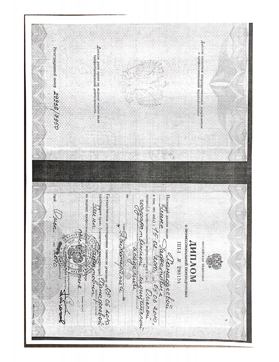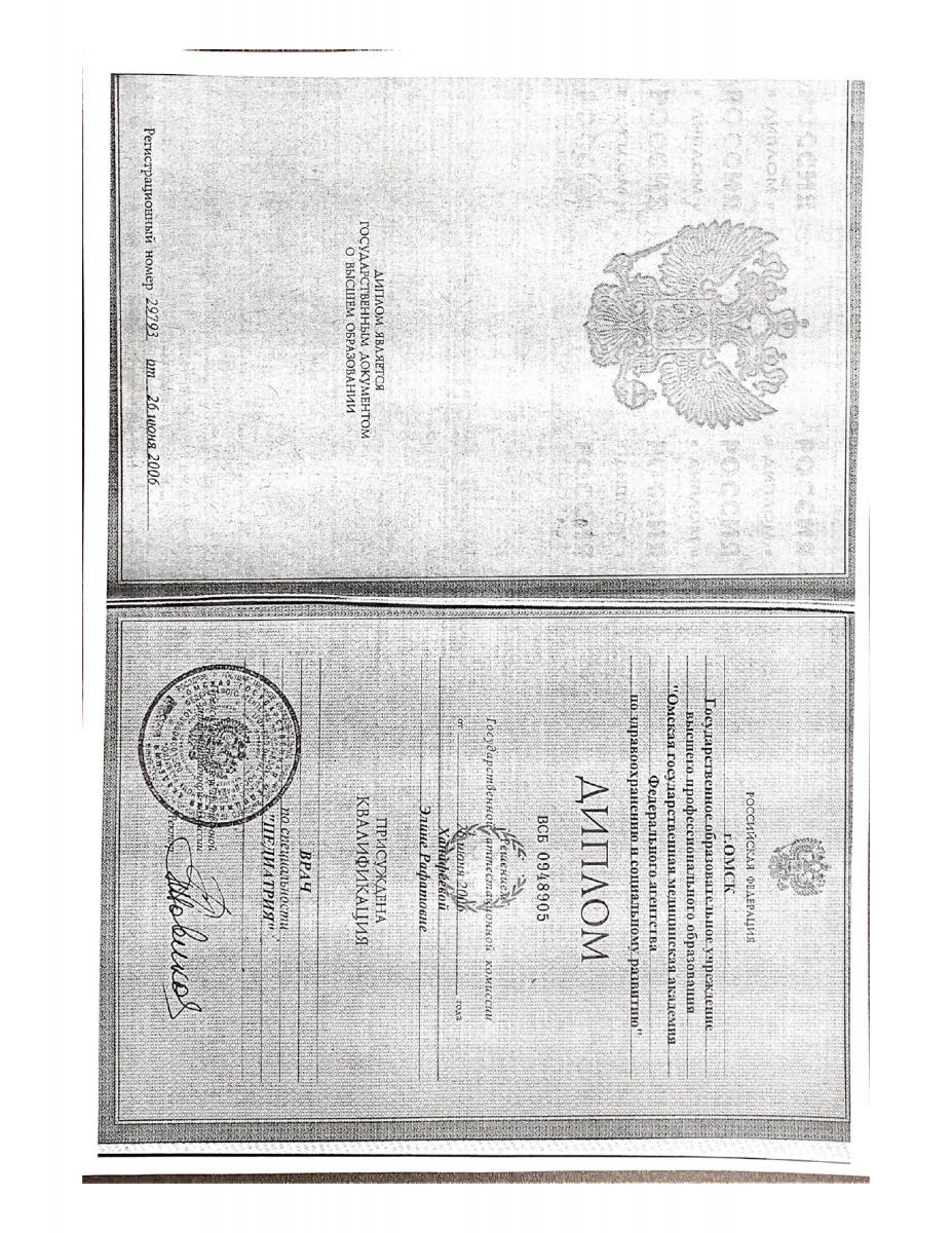 • 2000-2006гг. Омская Государственная Медицинская академия, педиатрический факультет, присвоена квалификация врача по специальности педиатрия.