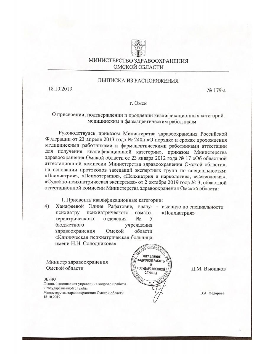 • 18.10.2019г. присвоена высшая квалификационная категория по специальности  «Психиатрия».