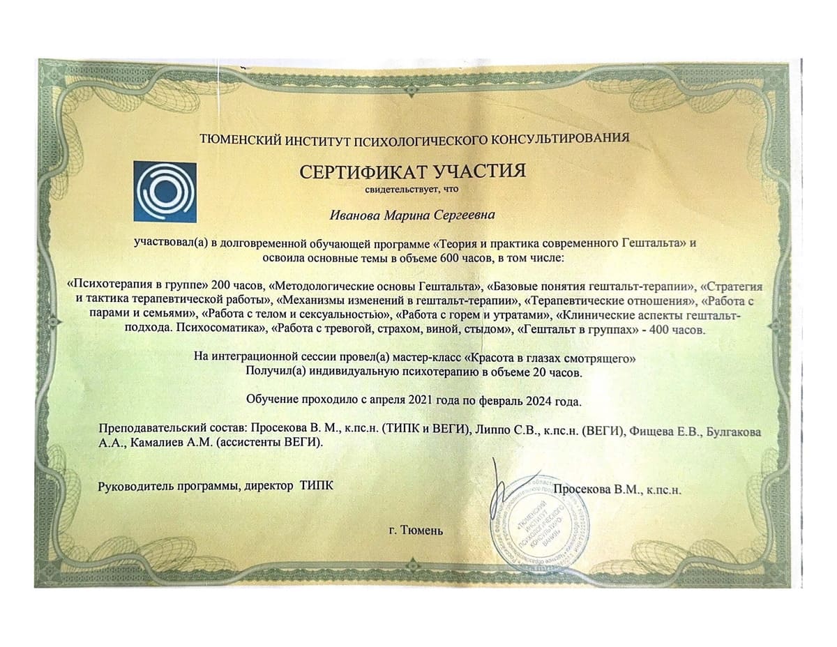 Тюменский институт психологического консультирования, сертификат участия «Теория и практика современного гештальта» 600 часов