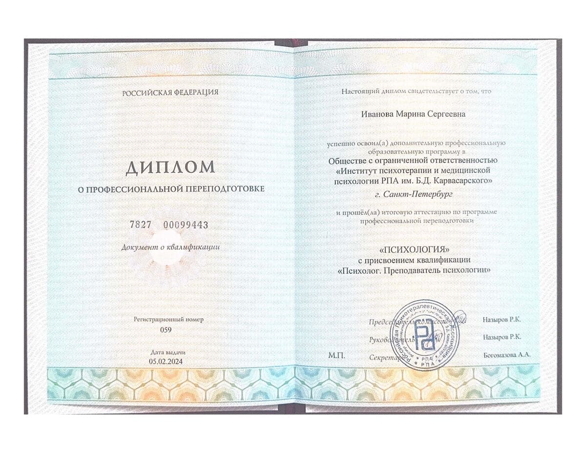 ООО «Институт психотерапии и медицинской психологии РПА им. Б.Д. Карвасарского, квалификация Психолог. Преподаватель психологии