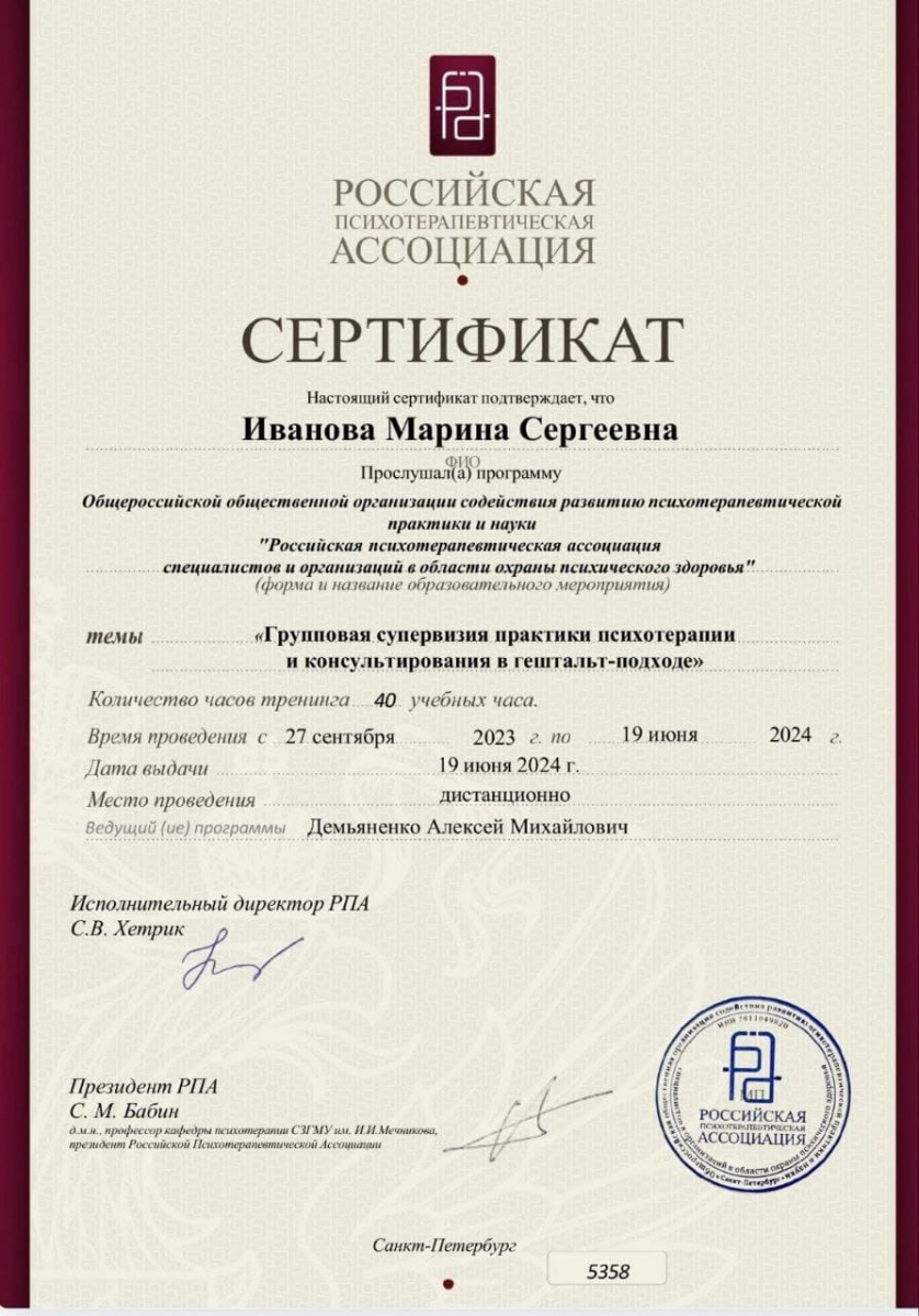 Сертификат участия в спецкурсе «Созависимость. Как работать с партнерами зависимых в гештальт терапии» МГИ , 120 ак часов.