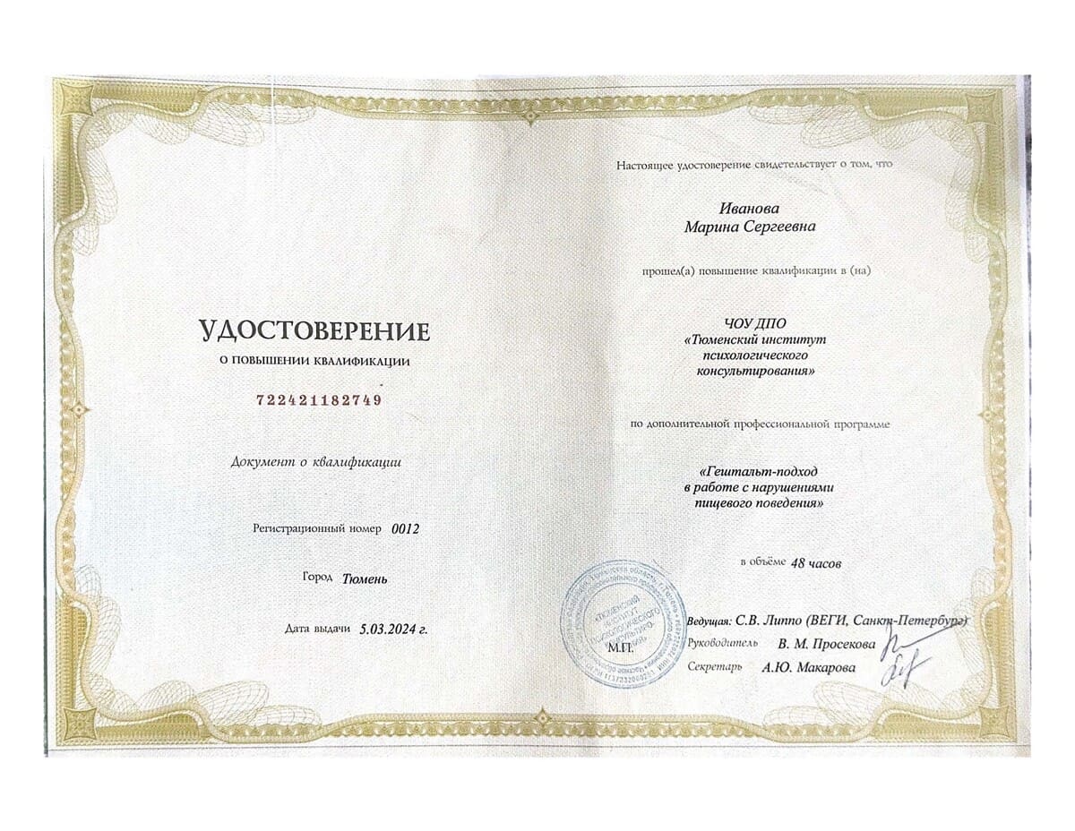 Тюменский институт психологического консультирования, удостоверение о повышении квалификации «Гештальт подход в работе с нарушениями пищевого поведения»