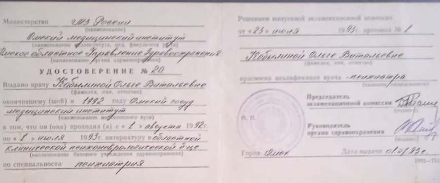 1992-1993- интернатура в Областной Клинической психиатрической больнице по специальности « Психиатрия»;