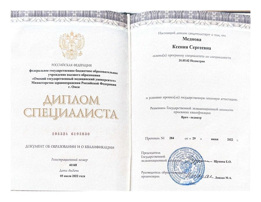2016–2022 гг. — Омский государственный медицинский университет (ОмГМУ), педиатрический факультет. Специальность педиатрия.