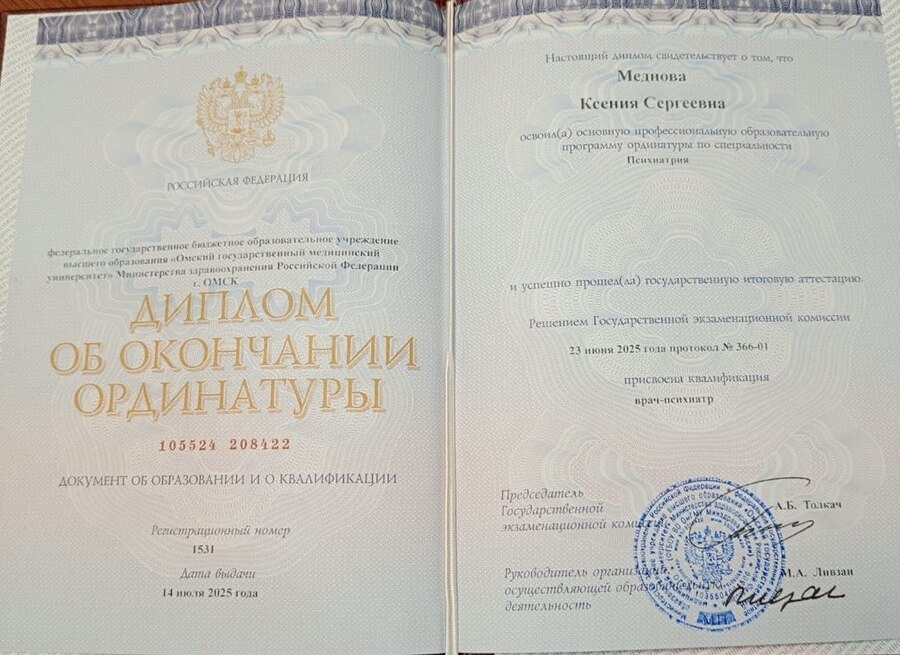 2023–2025 гг. — Ординатура на базе кафедры психиатрии, медицинской психологии ОмГМУ по специальности психиатрия.