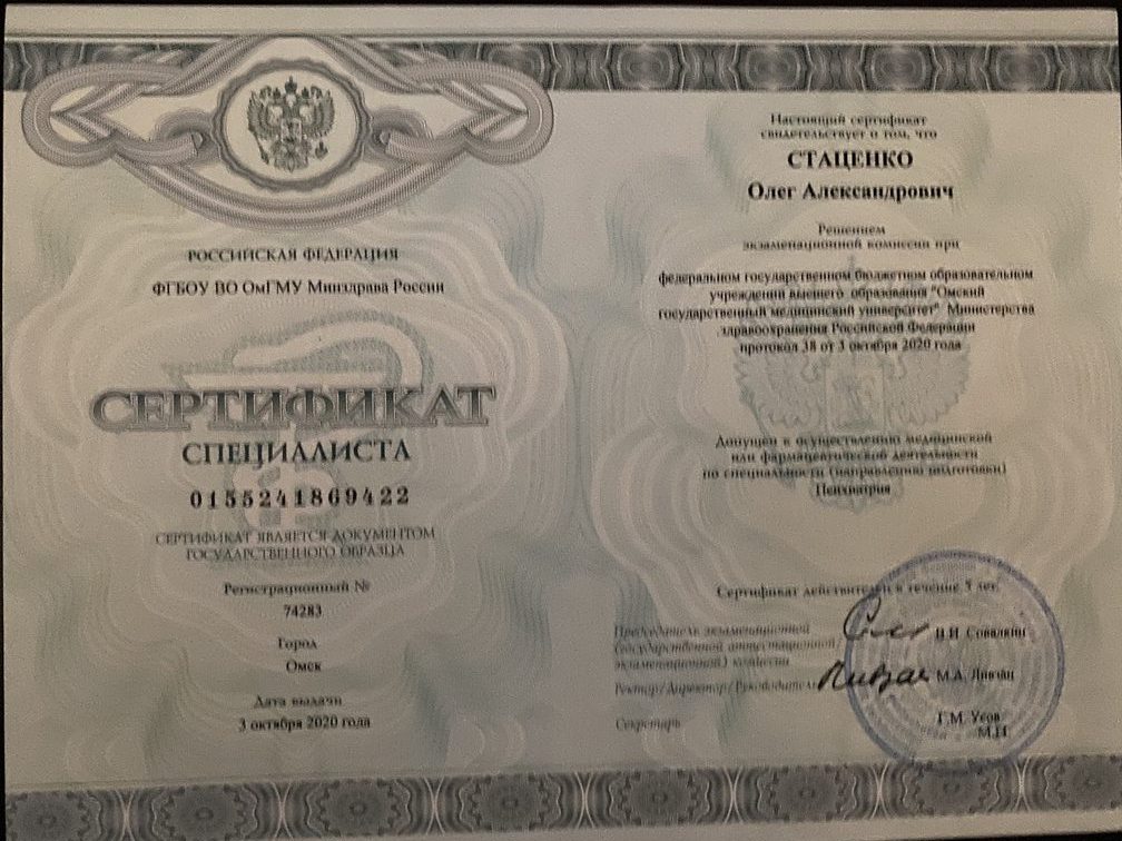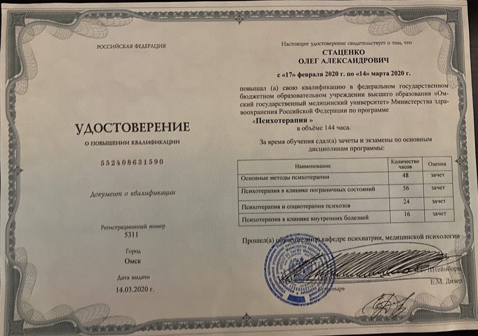 Кандидат медицинских наук, врач-психиатр высшей квалификационной категории, ассистент кафедры психиатрии, медицинской психологии ОмГМУ; Стаж работы по специальности 21 год